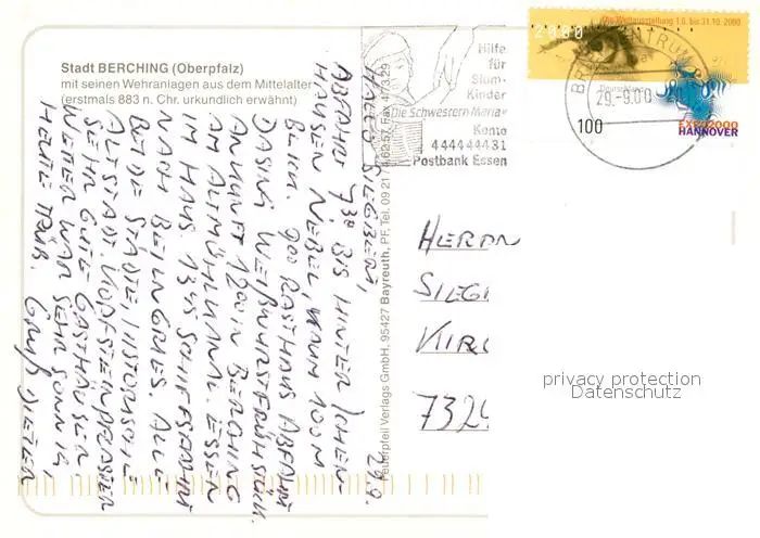 Berching Kleinod des Mittelalters Stadtbild mit Kirche Turm Wehranlagen Berching postalisch gelaufen 2000 Erhaltung siehe scans [FriedD77] Frierer