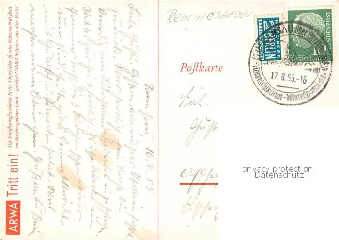 Berchtesgaden ARWA Feinstrumpfwirkerei Hans Thierfelder Berchtesgaden postalisch gelaufen 1955 Erhaltung siehe scans [FriedD77] Frierer
