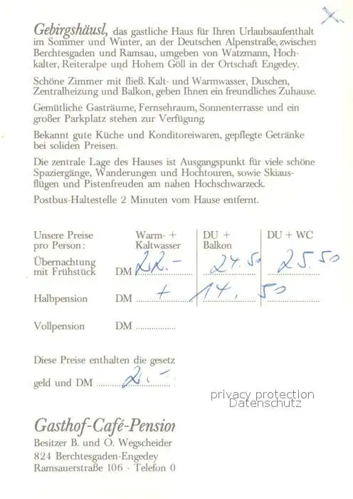 Berchtesgaden Gasthof Cafe Pension Gebirgshaeusl Gaststube Watzmann Berchtesgaden postalisch nicht gelaufen nach 1965 Werbekarte (keine Postkarte) Erhaltung siehe scans [WerneD78] Werbekarte (keine Postkarte) WernPID7