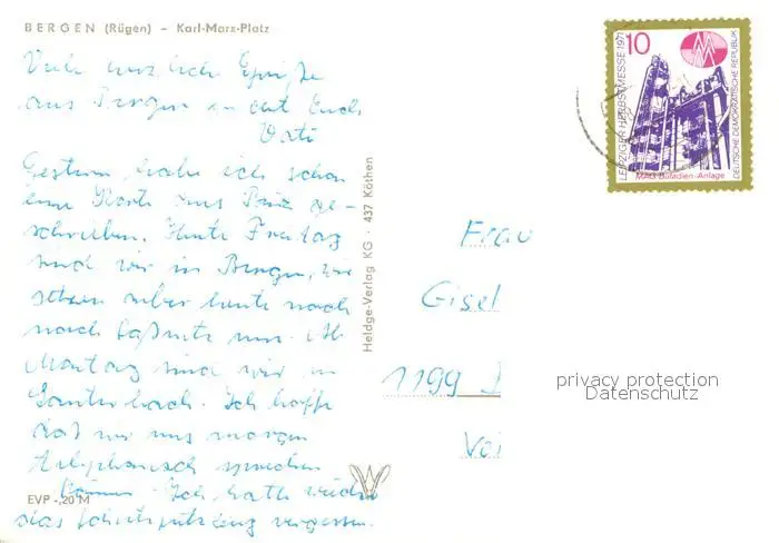 Bergen_Ruegen Karl Marx Platz Springbrunnen Bergen Ruegen postalisch gelaufen 1971 Erhaltung siehe scans [FriedD77] Frierer