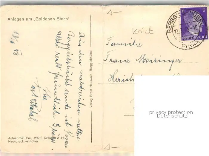 Berggiesshuebel Kneippkurort Anlagen am Gasthof Goldenen Stern Berggiesshuebel postalisch gelaufen 1943 Erhaltung siehe scans [FriedD77] Frierer