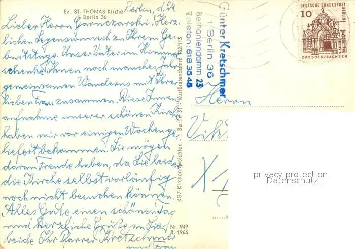 Berlin Evangelische St Thomas Kirche Innenansicht Berlin postalisch gelaufen 1960 Erhaltung siehe scans [FriedD77] Frierer