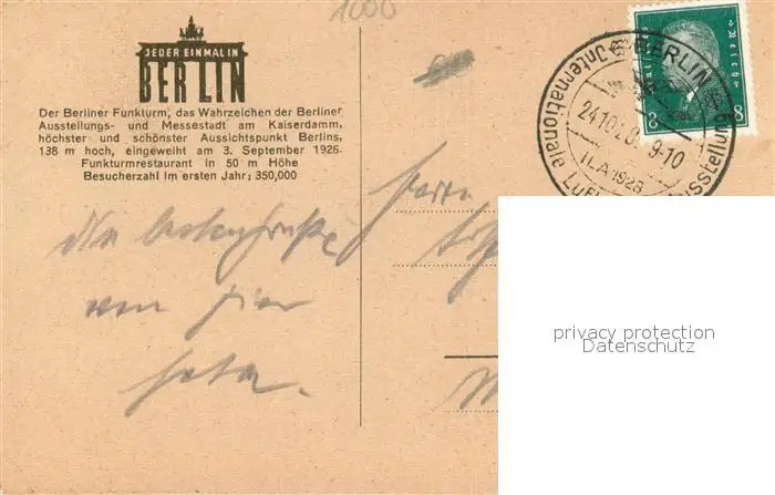 Berlin Funkturm m. Funkhalle Berlin postalisch gelaufen 1928 Erhaltung siehe scans [LiesaD40] LiesID40