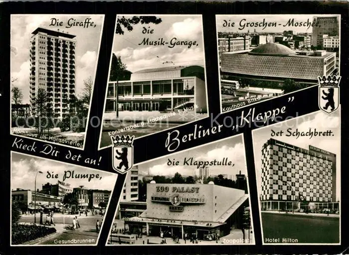 Berlin Giraffe Musikgarage Groschen Moschee Plumpe Klappstulle Schachbrett Hotel Hilton Berlin postalisch gelaufen 1965 Erhaltung siehe scans [KathaD81] Kathoren