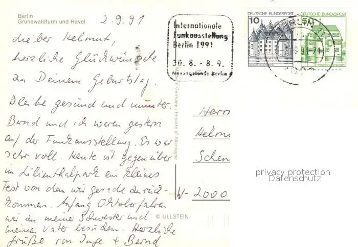 Berlin Grunewaldturm Havel Berlin postalisch gelaufen 1991 Erhaltung siehe scans [KathaD81] Kathoren