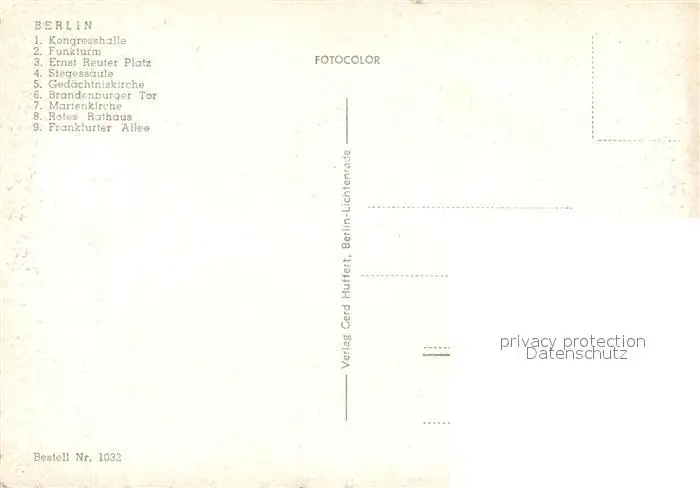 Berlin Kongresshalle Funkturm Ernst Reuter Platz Siegessaeule Gedaechtniskirche Brandenburger Tor Marienkirche Rotes Rathaus Frankfurter Allee Berlin postalisch nicht gelaufen nach 1965 Erhaltung siehe scans [WerneD78] WernPID7