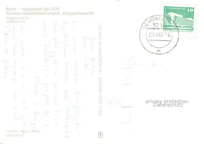 Berlin Konsum Gaststaettenkomplex Mueggelseeperle Mueggelstube Jagdkeller Berlin postalisch gelaufen 1985 Erhaltung siehe scans [FriedD77] Frierer