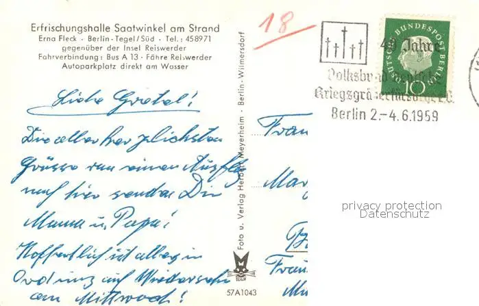 Berlin Tegel Kategorie Alte Ansichtskarten Postkarten bx64143 Berlin Tegel Erfrischungshalle Saatwinkel am Strand Berlin Tegel postalisch gelaufen 1959 Erhaltung siehe scans [KathaD81]
