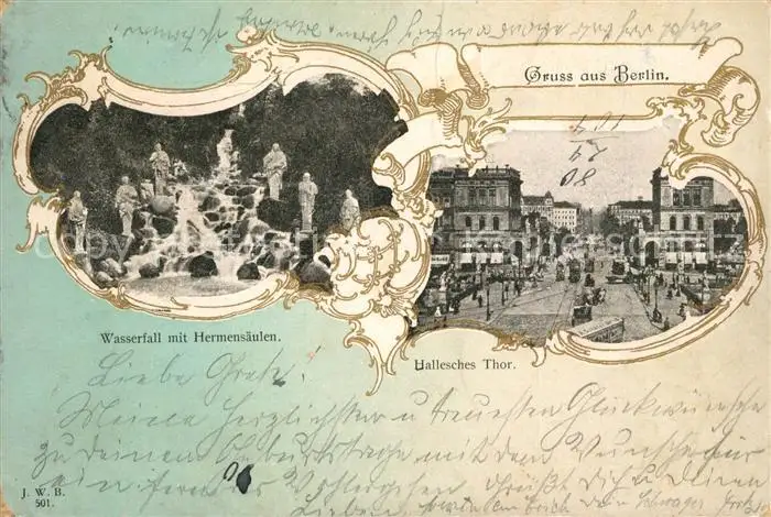 Berlin Wasserfall mit Hermensaeulen Hallesches Thor Berlin postalisch gelaufen 1902 Erhaltung siehe scans [WerneD78] WernPID7