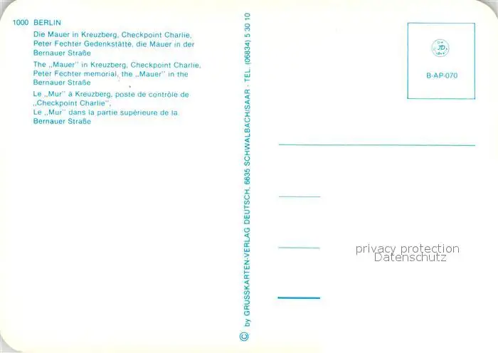 Berliner_Mauer_Berlin_Wall Kreuzberg Checkpoint Charlie Peter Fechter Gedenkstaette Bernauer Strasse Berliner_Mauer postalisch nicht gelaufen nach 1965 Erhaltung siehe scans [PaolaD17] PaolPID1