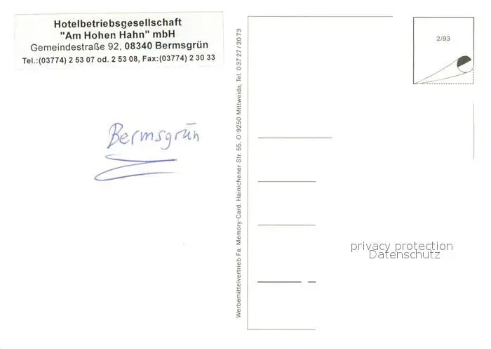 Bermsgruen Hotel Gaststaette Am hohen Hahn Winterlandschaft Bermsgruen postalisch nicht gelaufen nach 1965 Erhaltung siehe scans [FriedD77] Frierer