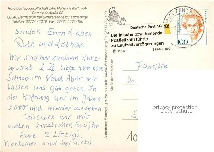 Bermsgruen Hotel Gaststaette Am hohen Hahn Winterlandschaft Bermsgruen postalisch gelaufen 1999 Erhaltung siehe scans [FriedD77] Frierer