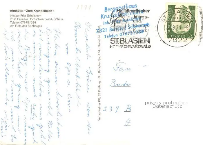Bernau_Schwarzwald Almhuette zum Krunkelbach am Feldberg Gastraeume Zimmer Bernau Schwarzwald postalisch gelaufen 1971 Erhaltung siehe scans [WerneD78] WernPID7