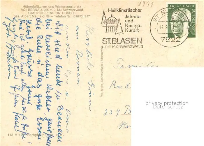 Bernau_Schwarzwald Gasthof Pension Roessle Bernau Schwarzwald postalisch gelaufen 1971 Erhaltung siehe scans [WerneD78] WernPID7