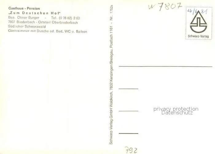 Biederbach_Schwarzwald Gasthaus Pension Deutscher Hof Biederbach Schwarzwald postalisch nicht gelaufen 1981 Erhaltung siehe scans [WerneD78] WernPID7