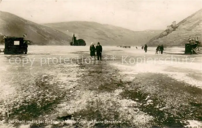 AK / Ansichtskarte Bingen_Rhein Der Rhein im Eis bei Bingen mit Maeuseturm und Ruine Ehrenfels Bingen Rhein