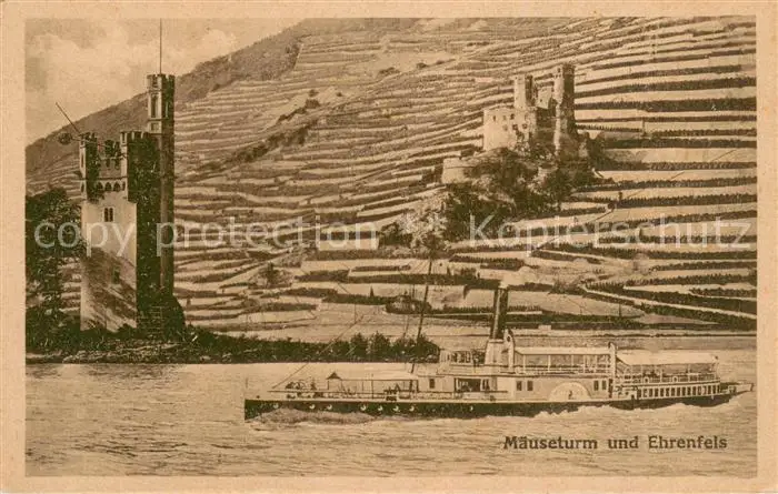 Bingerbrueck_Rhein Maeuseturm und Burg Ehrenfels Rheindampfer Bingerbrueck Rhein postalisch nicht gelaufen 1919 Erhaltung siehe scans [FriedD77] Frierer