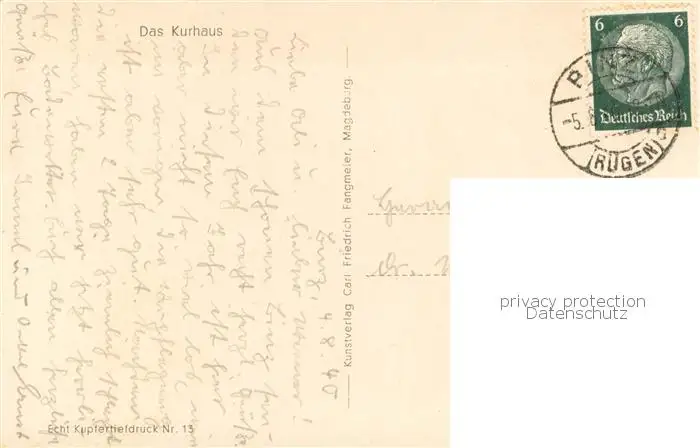 Binz_Ruegen Strand Kurhaus Ostseebad Kupfertiefdruck Nr. 13 Serie Aus deutschen Landen Binz_Ruegen postalisch gelaufen 1940 Erhaltung siehe scans [FriedD77] Frierer