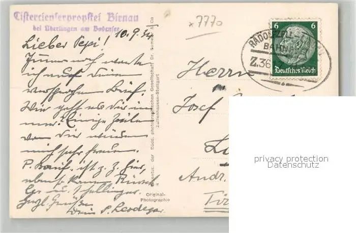 Birnau Klosterkirche Zisterzienserpropstei Birnau postalisch gelaufen 1934 Bahnpost Erhaltung siehe scans [FriedD77] Bahnpost Frierer