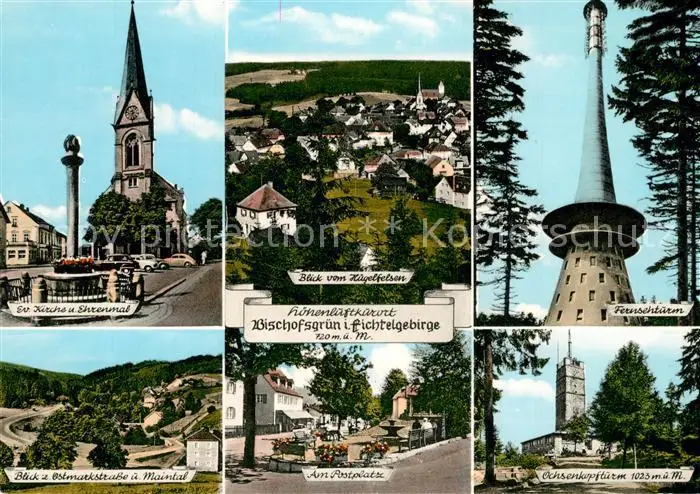 AK / Ansichtskarte Bischofsgruen Kirche Ehrenmal Blick vom Huegelfelsen Fernsehturm Maintal Postplatz Ochsenkopfturm Fichtelgebirge Bischofsgruen