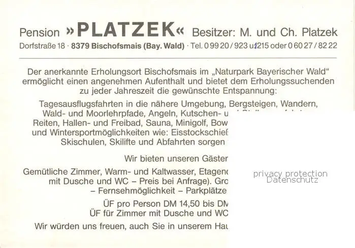 Bischofsmais Pension Platzek Kirche Landschaftspanorama Bischofsmais postalisch nicht gelaufen nach 1965 Werbekarte (keine Postkarte) Erhaltung siehe scans [FriedD77] Werbekarte (keine Postkarte) Frierer