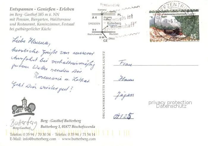 Bischofswerda Berggasthof Butterberg Restaurant Aussichtsturm Partie im Wald Bischofswerda postalisch gelaufen 2012 Erhaltung siehe scans [FriedD77] Frierer