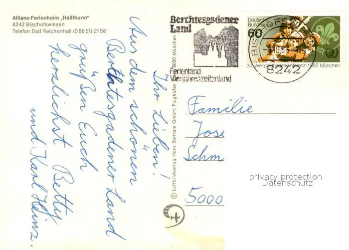 Bischofswiesen Fliegeraufnahme mit Allianz Ferienheim Hallthurm Bischofswiesen postalisch gelaufen 1985 Erhaltung siehe scans [WerneD78] WernPID7