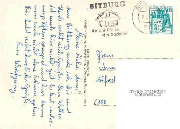 Bitburg Marktplatz Teilansicht Anlage Maximiner Waeldchen Sporthotel Stausee Schwimmbad Ehrenfriedhof Albachgrotte Rathaus und Liebfrauenkirche Bitburg postalisch gelaufen 1977 Erhaltung siehe scans [WerneD78] WernPID7