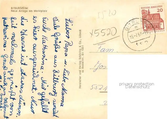 Bitburg Neue Anlage am Marktplatz Bitburg postalisch gelaufen 1967 Erhaltung siehe scans [FriedD77] Frierer