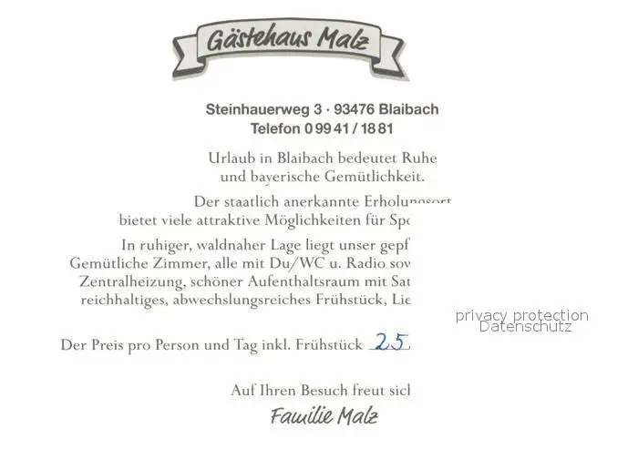 Blaibach Gaestehaus Malz Gaststube Fremdenzimmer Panorama Bayerischer Wald Blaibach postalisch nicht gelaufen nach 1965 Werbekarte (keine Postkarte) Erhaltung siehe scans [FriedD77] Werbekarte (keine Postkarte) Frierer