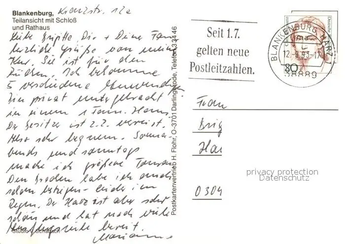 Blankenburg_Harz Fliegeraufnahme mit Schloss und Rathaus Blankenburg_Harz postalisch gelaufen 1993 Erhaltung siehe scans [WerneD78] WernPID7