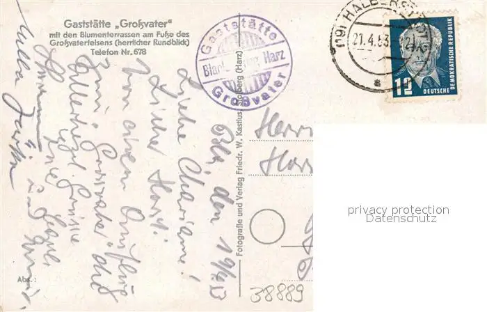 Blankenburg_Harz Gaststaette Grossvater am Fusse des Grossvaterfelsens Blankenburg_Harz postalisch gelaufen 1953 Erhaltung siehe scans [FriedD77] Frierer