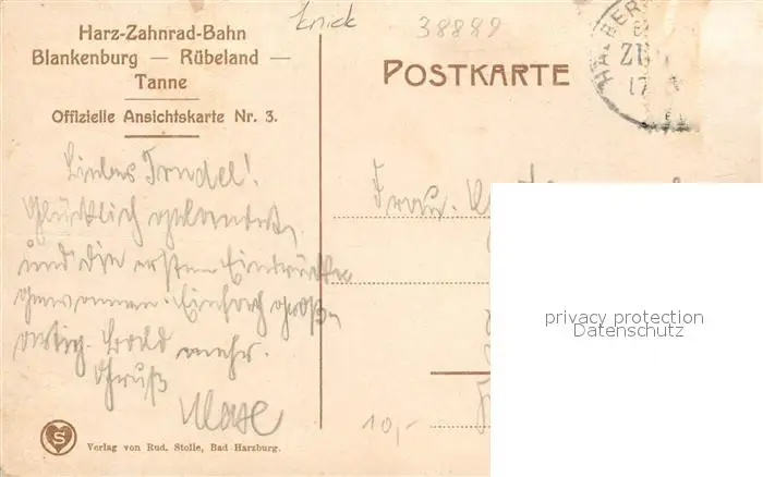 Blankenburg_Harz Harz Zahnrad Bahn Blankenburg Ruebeland Tanne Blankenburg_Harz postalisch gelaufen bis 1920 Bahnpost Erhaltung siehe scans [WerneD78] Bahnpost WernPID7