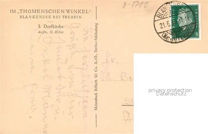 Blankenese_Trebbin Serie Im Thuemenschen Winkel Nr. 3 Dorfkirche postalisch gelaufen 1930 Erhaltung siehe scans [FriedD77] Frierer