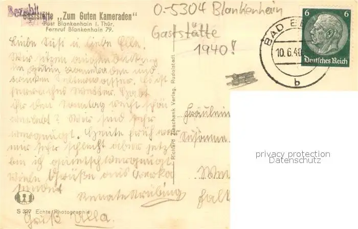 Blankenhain_Thueringen Gaststaette Zum Guten Kameraden Innen- und Aussenansicht Blankenhain_Thueringen postalisch gelaufen 1940 Erhaltung siehe scans [LiesaD40] LiesID40