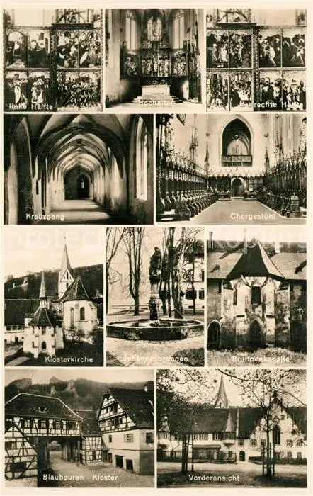 Blaubeuren Klosterkirche Hochaltar links und rechts Kreuzgang Chorgestuehl Johannesbrunnen Brunnenkapelle Blaubeuren postalisch nicht gelaufen 1921-1965 Erhaltung siehe scans [WerneD78] WernPID7