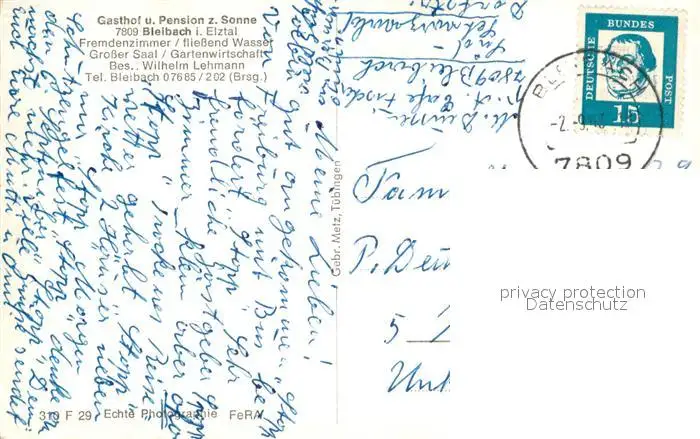 Bleibach Historisches Orchestrian Gasthof Pension zur Sonne Bleibach postalisch gelaufen 1953 Erhaltung siehe scans [FriedD77] Frierer