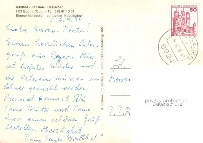 Boebing Gasthof Pension Haslacher Gaststube Zimmer Boebing postalisch gelaufen 1980 Erhaltung siehe scans [WerneD78] WernPID7