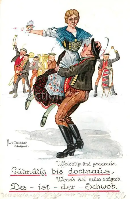 Boettcher_Hans_Stuttgart Kategorie Alte Ansichtskarten Postkarten bx75296 Boettcher_Hans_Stuttgart Tanz Trachten Musikkapelle Trommel Schwaben Boettcher_Hans_Stuttgart postalisch gelaufen 1923 Erhaltung siehe scans [PaolaD17]