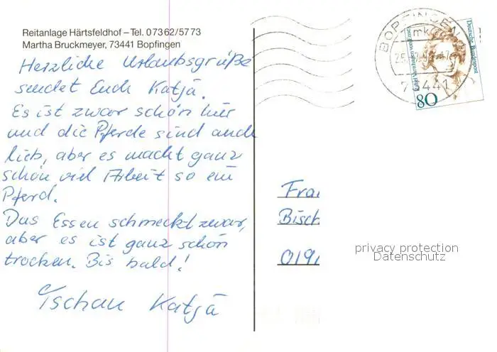 Bopfingen_Ipf Reitanlage Haertsfeldhof Gaestezimmer Pferdekoppel Ausritt Bopfingen Ipf postalisch gelaufen 1995 Erhaltung siehe scans [FriedD77] Frierer