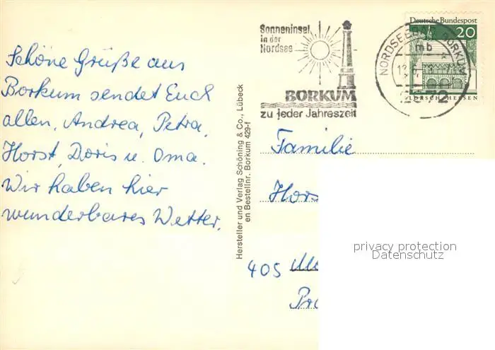 Borkum_Nordseebad Strand Inselbahnhof Promenade Leuchtturm Sonnenuntergang Fliegeraufnahme Borkum_Nordseebad postalisch gelaufen ca. 1970 Erhaltung siehe scans [FriedD77] Frierer