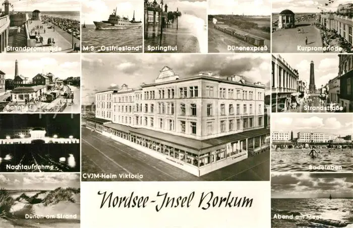 AK / Ansichtskarte Borkum_Nordseebad Strandpromenade Springflut Duenenexpress Kurpromenade Bahnhof Nachtaufnahme Duenen CVM Heim Viktoria Strandstrasse Borkum_Nordseebad