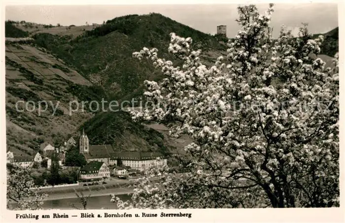 AK / Ansichtskarte Bornhofen_Kamp Durchblick zum Ort mit Ruine Sterrenberg Fruehling am Rhein Bornhofen Kamp