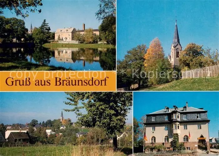 AK / Ansichtskarte Braeunsdorf_Oberschoena Grosser Teich Kirche Teilansicht Rathaus