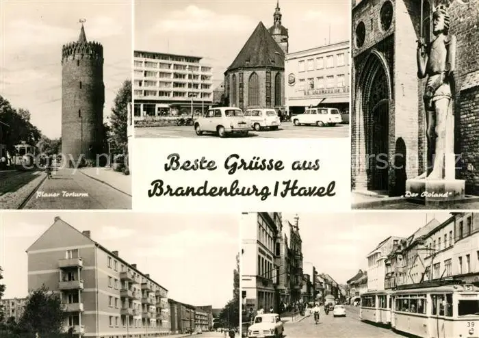 AK / Ansichtskarte Brandenburg_Havel Plauer Torturm Kirche Roland Statue Wohnsiedlung Strassenbahn Brandenburg Havel