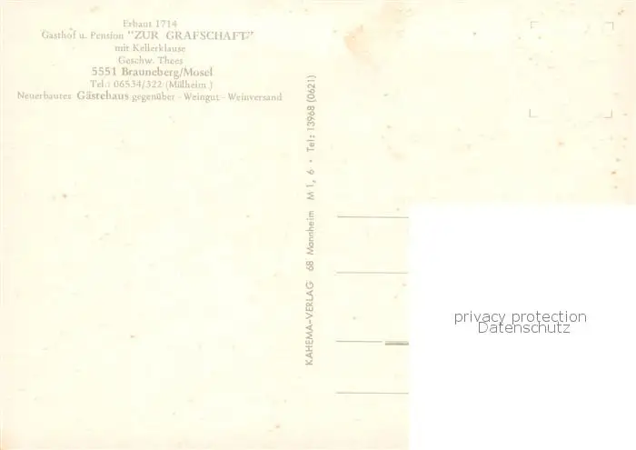 Brauneberg Gasthaus Zur Grafschaft Brauneberg postalisch nicht gelaufen nach 1965 Erhaltung siehe scans [WerneD78] WernPID7