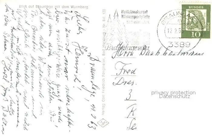 Braunlage Panorama mit dem Wurmberg Braunlage postalisch gelaufen 1962 Erhaltung siehe scans [WerneD78] WernPID7