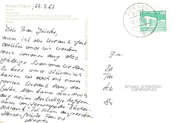 Breege_Ruegen Strand Parkanlage Ferienheim Sender Breege Ruegen postalisch gelaufen 1987 Erhaltung siehe scans [FriedD77] Frierer