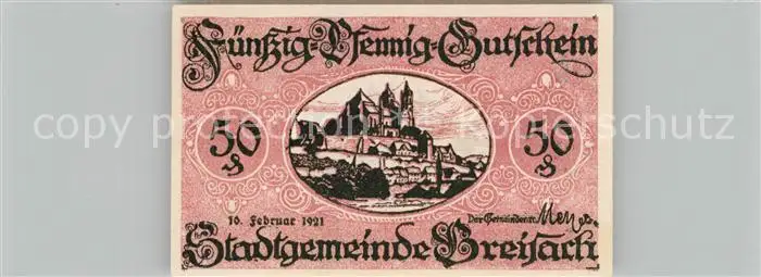 Breisach_Rhein Muenster Fuenfzig Pfenning Gutschein Breisach Rhein postalisch nicht gelaufen 1921 Notgeldschein (keine Postkarte) Erhaltung siehe scans [FriedD77] Notgeldschein (keine Postkarte) Frierer