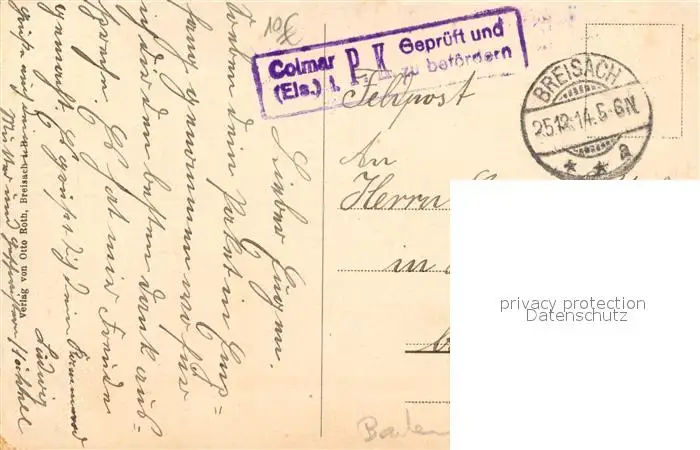 Breisach_Rhein Rhein Schiffsbruecke Muenster Stempel geprueft Breisach Rhein postalisch gelaufen 1914 Feldpostkarte Erhaltung siehe scans [FriedD77] Feldpostkarte Frierer